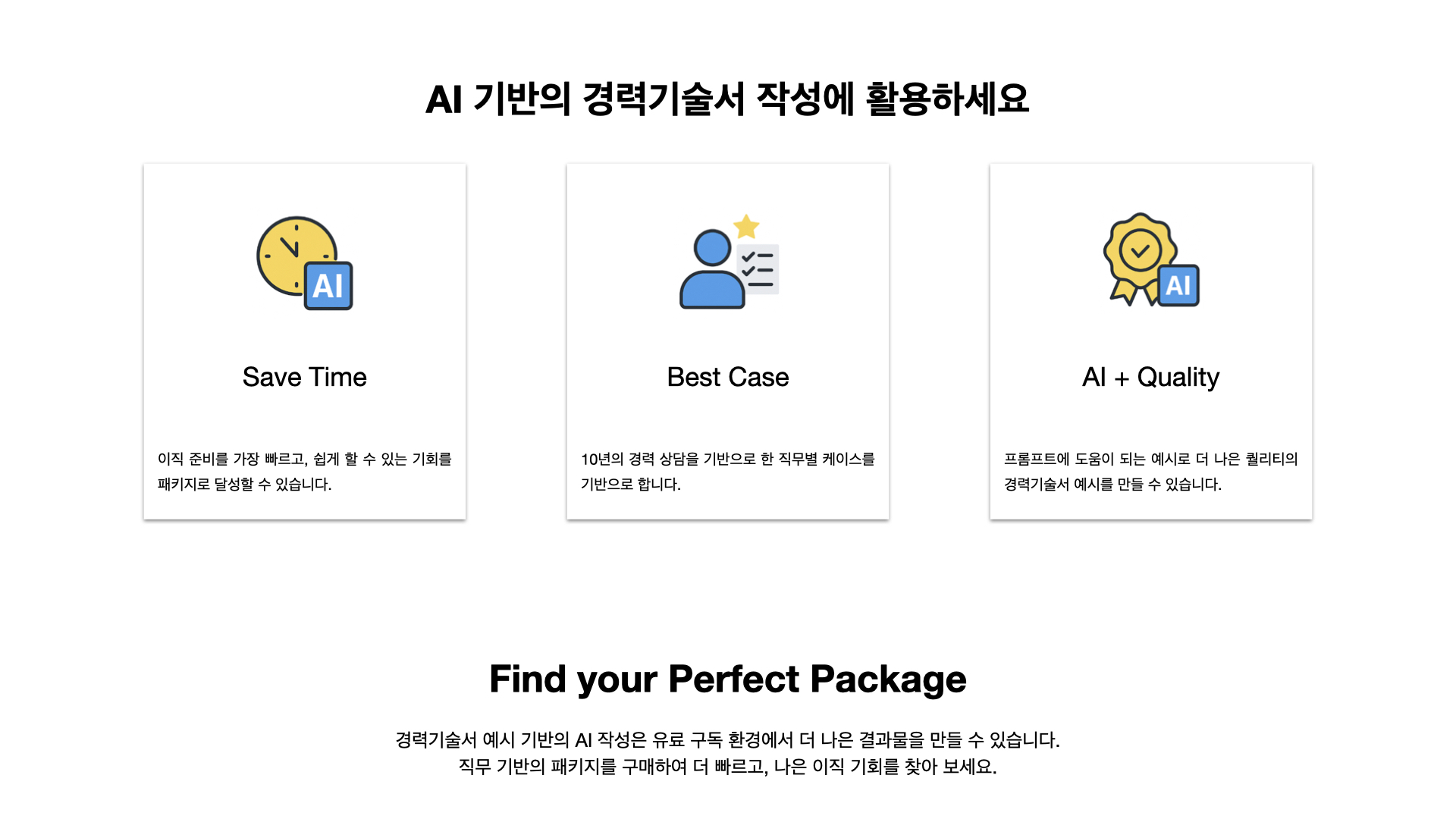 | 1단계 - 직무별 경력기술서 예시/샘플 구매 | 2단계 - 생성형AI 업로드 및 리뷰 (형식 위주) or 참고 예시로 직접 작성 | 3단계 - 기존 서류 업로드 및 프롬프트 가이드 활용으로 퀄리티 / 작성 자동화 |